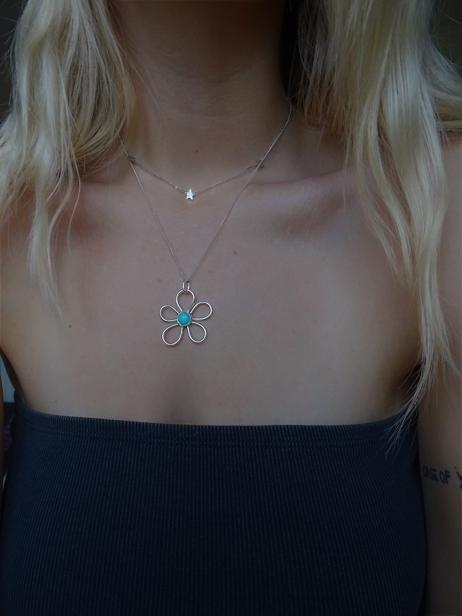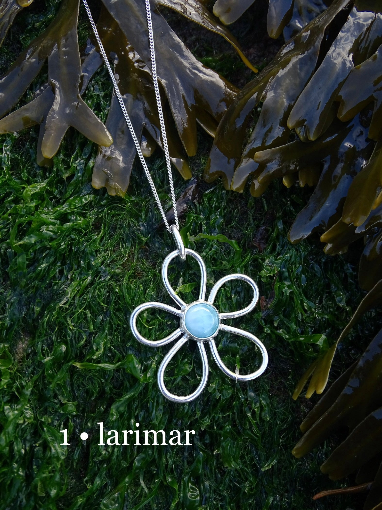 gemstone flower pendant. a collection of stones set in the middle of silver wire petals.