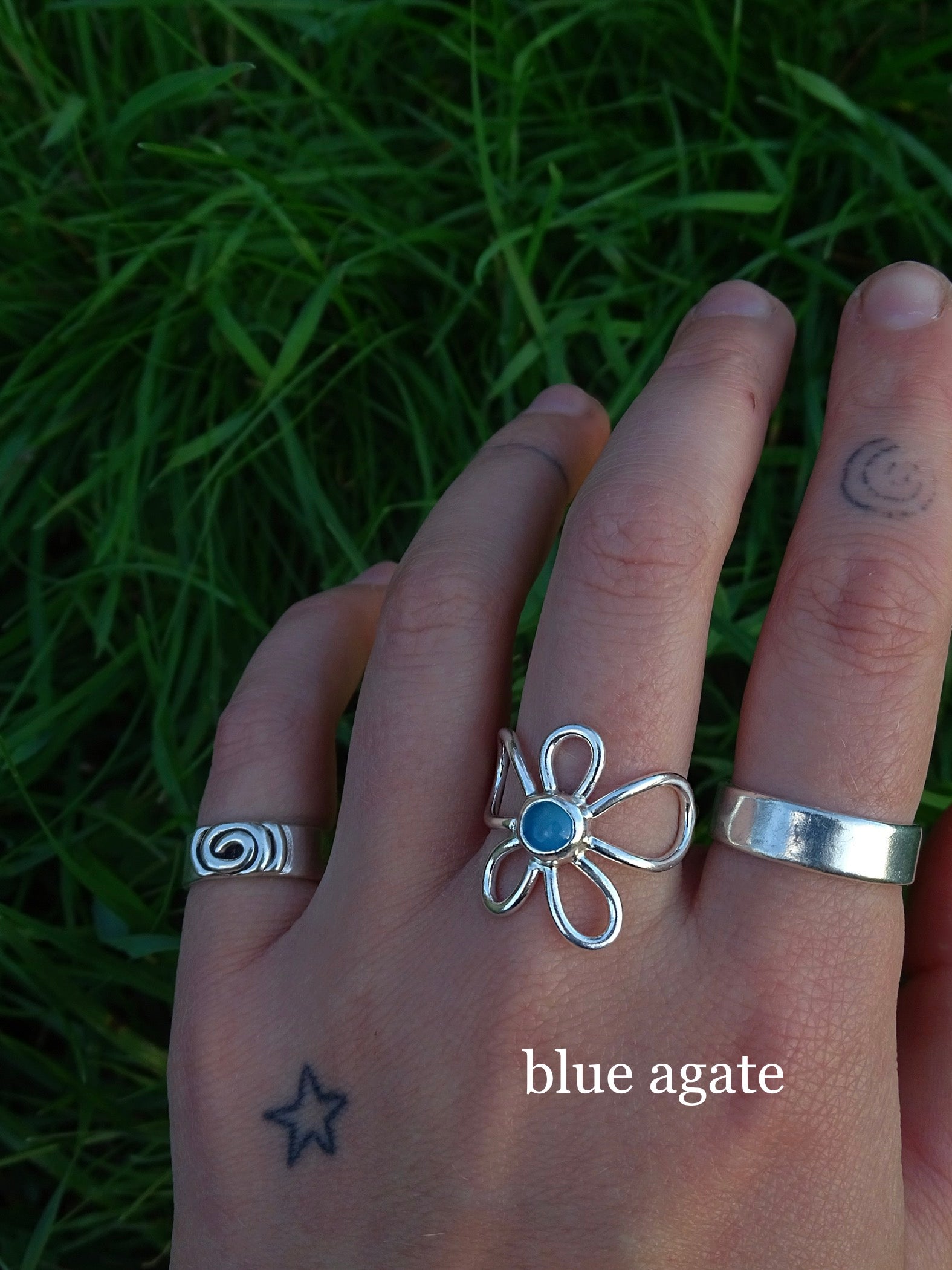 gemstone flower rings. these rings are handcrafted with 925 sterling silver and gemstones, and each one is one-of-a-kind.