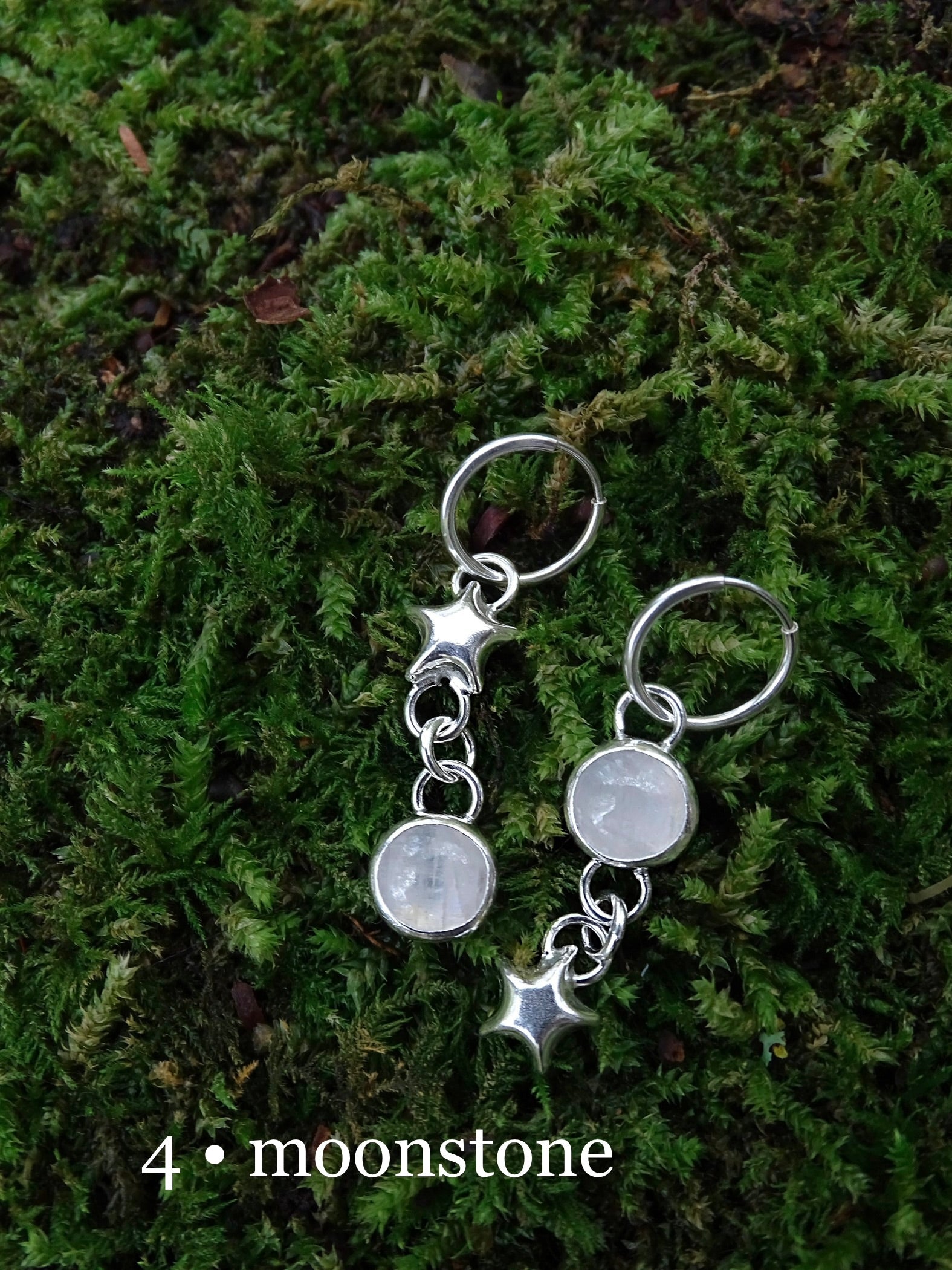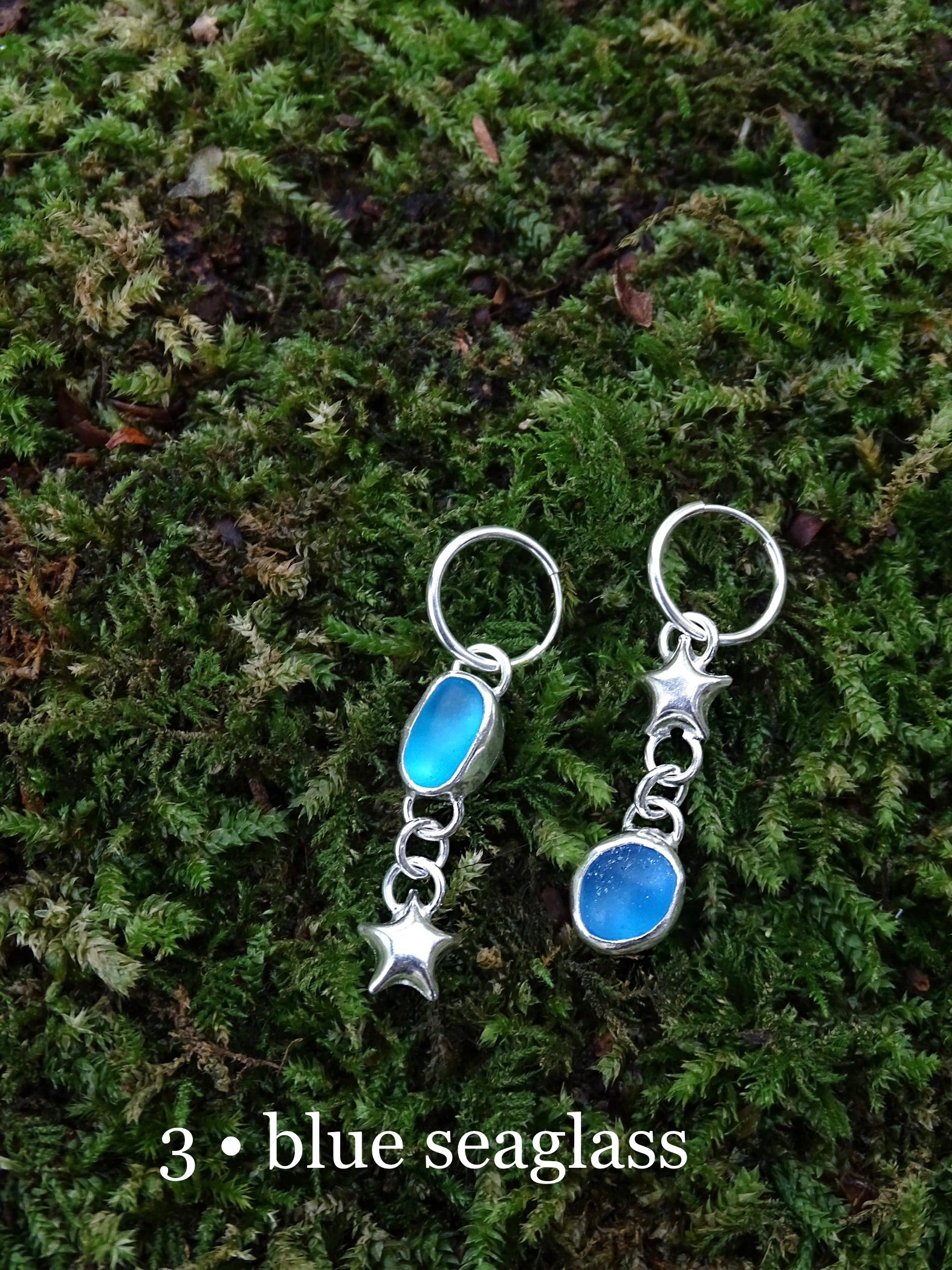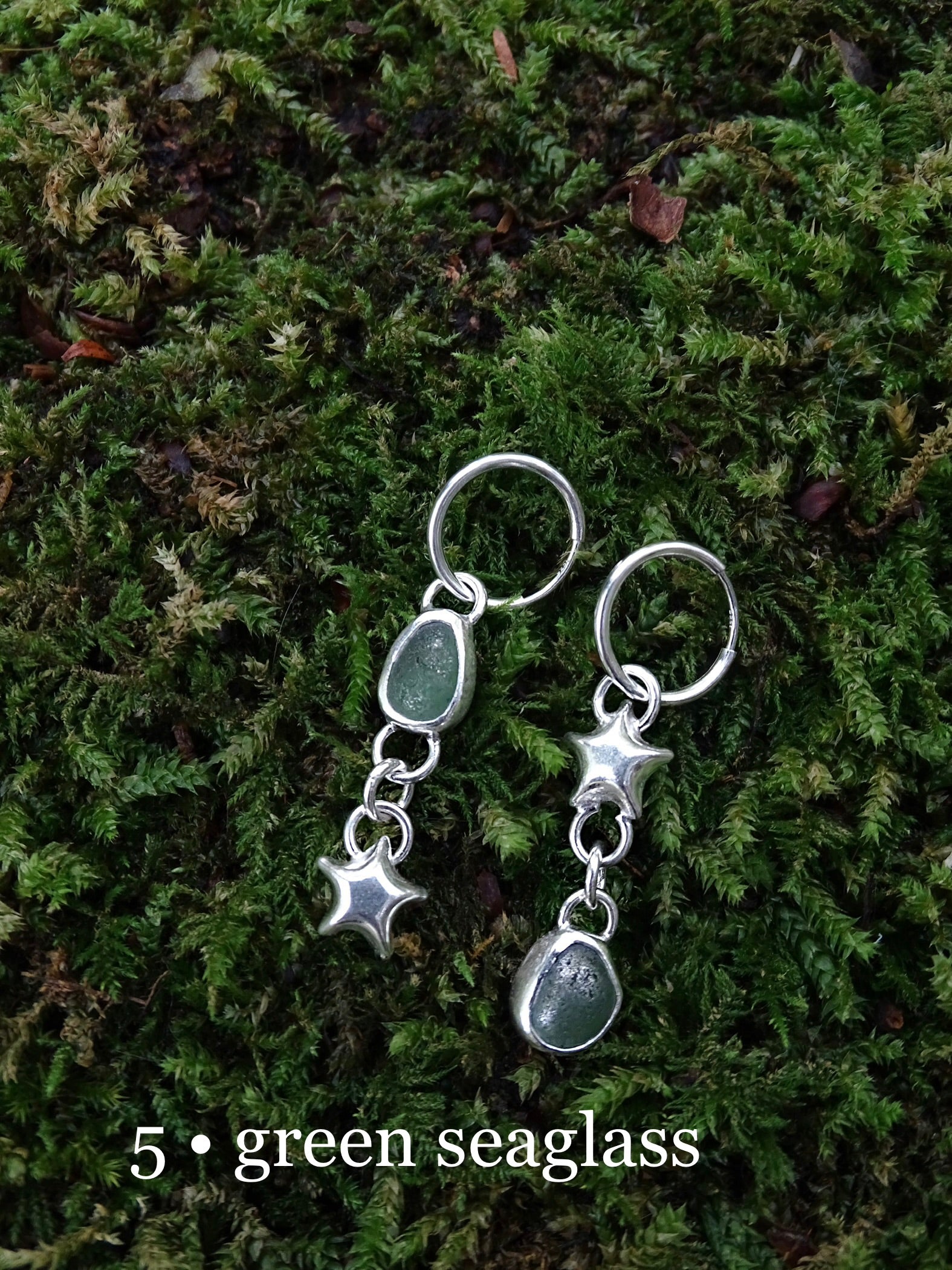 asymmetrical star hoop earrings. a range of gems and seaglass, matched with little stars and set in an asymmetric style with 15mm endless hoops.