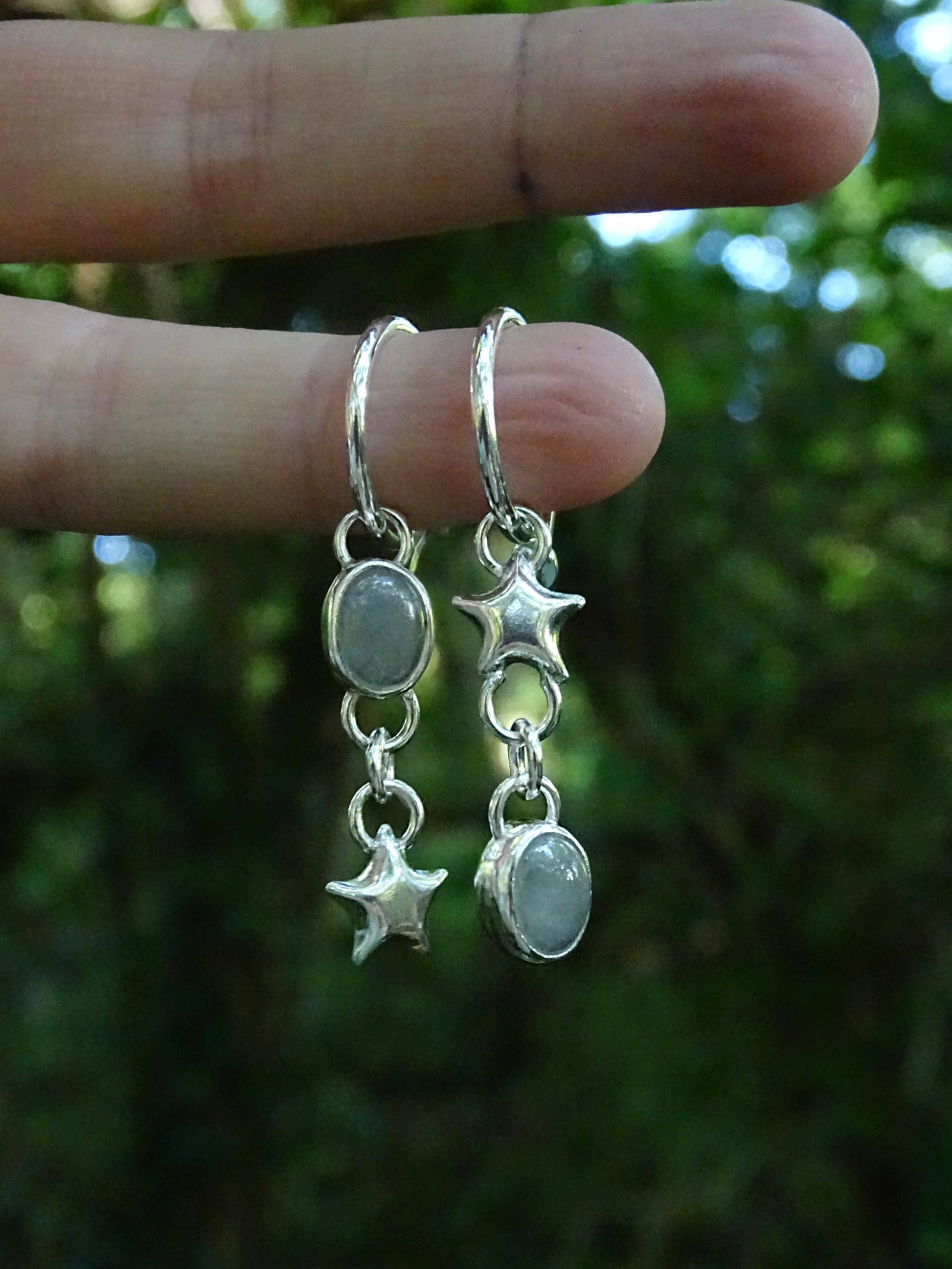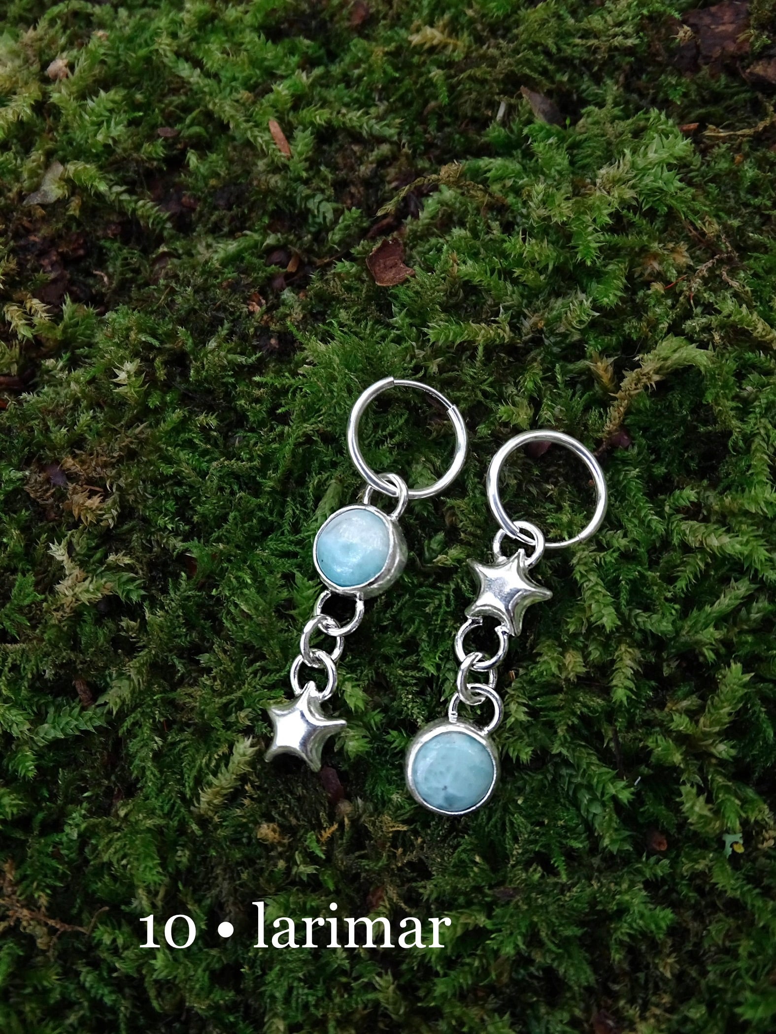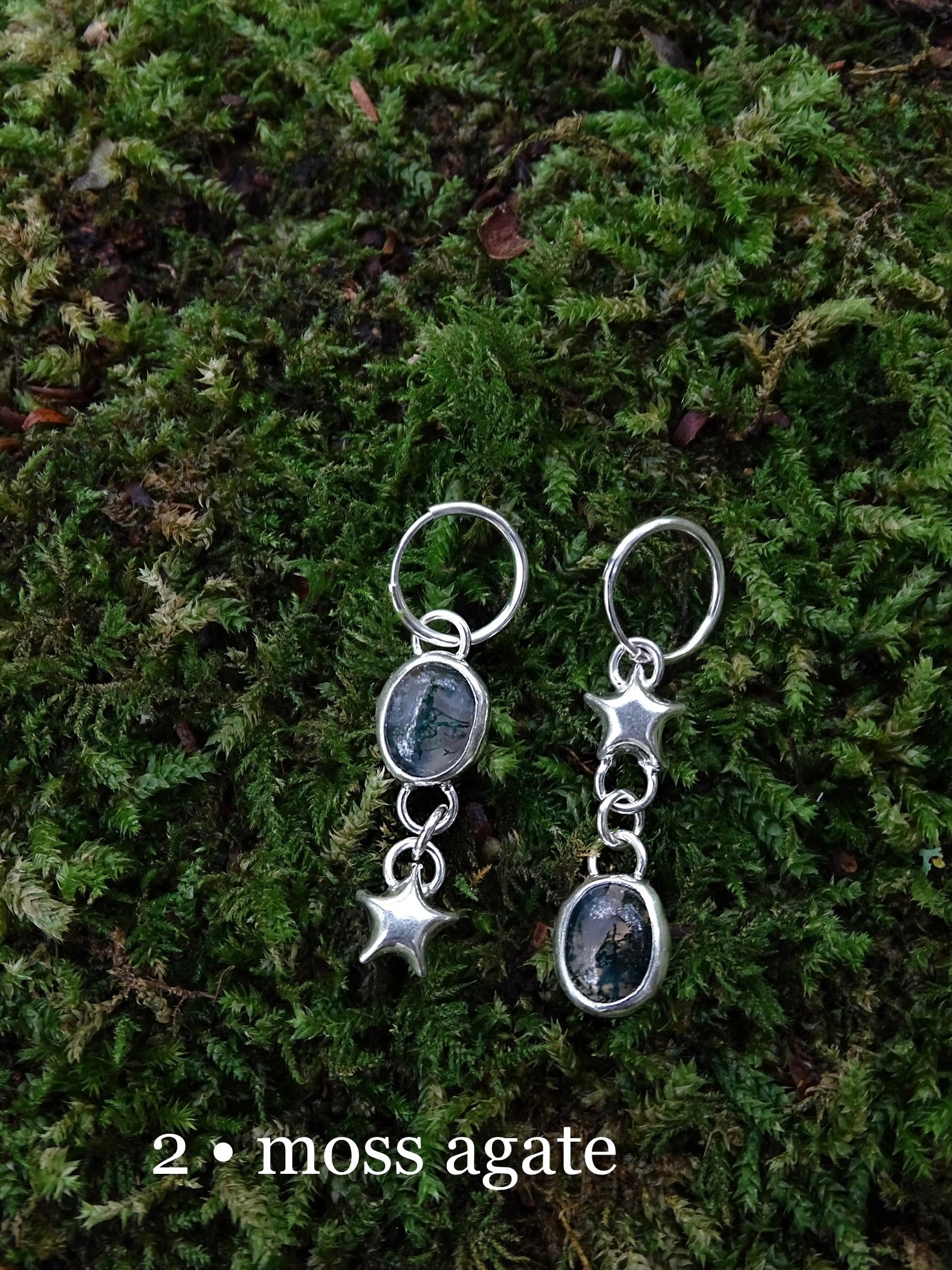 asymmetrical star hoop earrings. a range of gems and seaglass, matched with little stars and set in an asymmetric style with 15mm endless hoops.