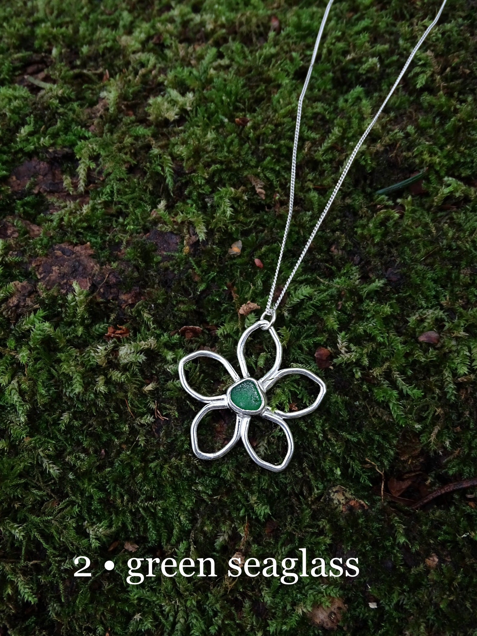 seaglass flower pendant. glowy seaglass set in the middle of silver wire petals.