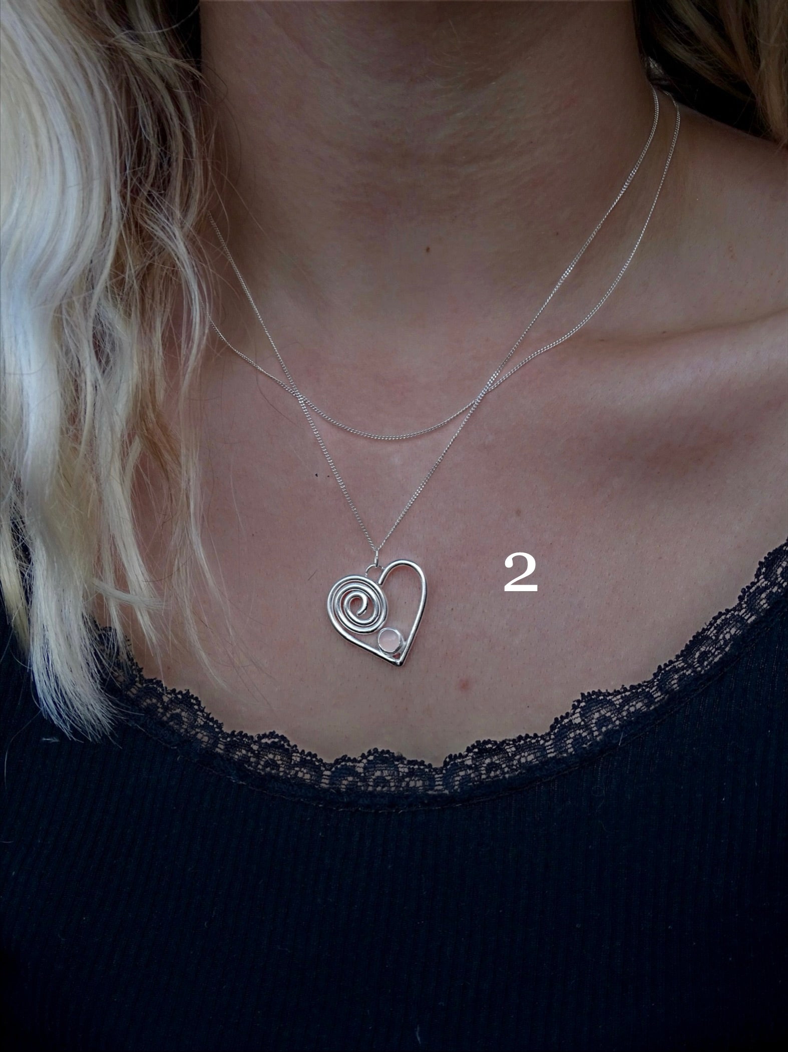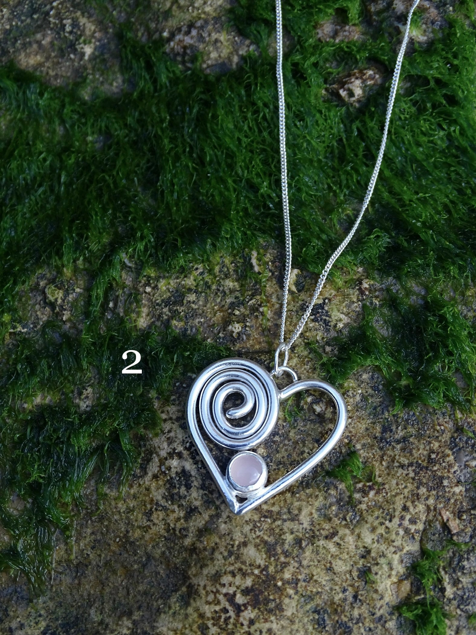 2 • spiral heart with rose quartz. paired with an 18” chain.