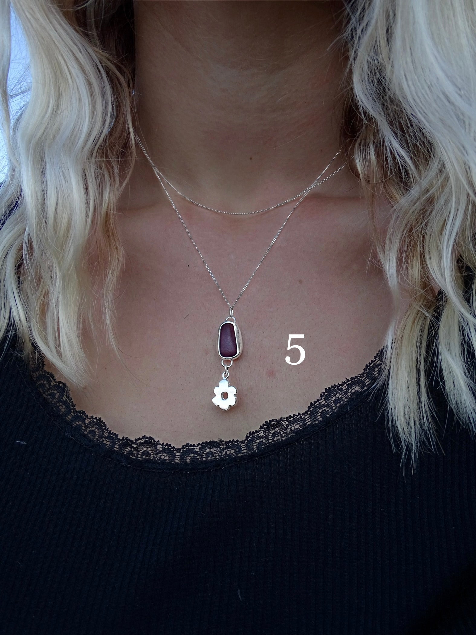 5 • purple seaglass in a backless setting, with a solid silver flower. paired with a 16” chain.