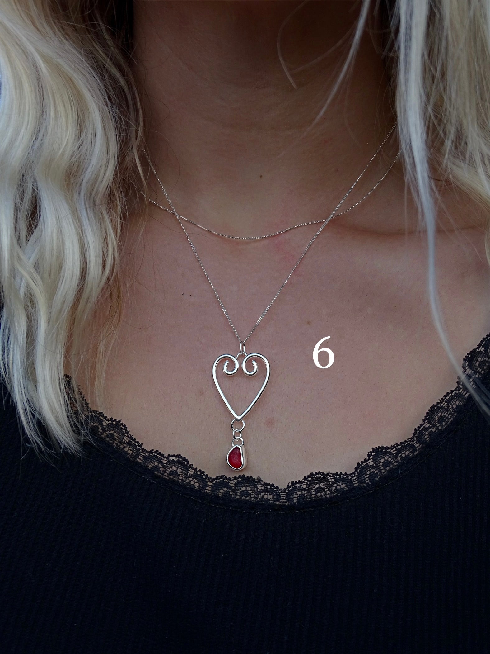 6 • swirly heart with red seaglass. paired with a 16” chain.
